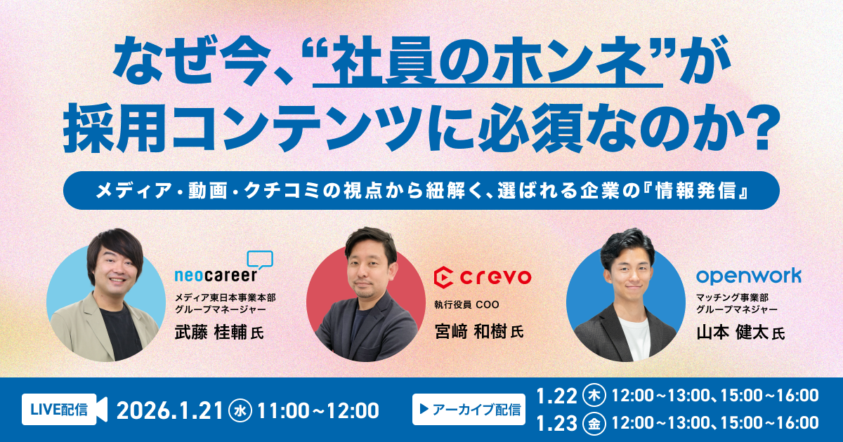 本ウェビナーでは、社員のリアルな声やホンネを採用コンテンツに活かし、応募者の心を動かす方法をわかりやすく紹介します。